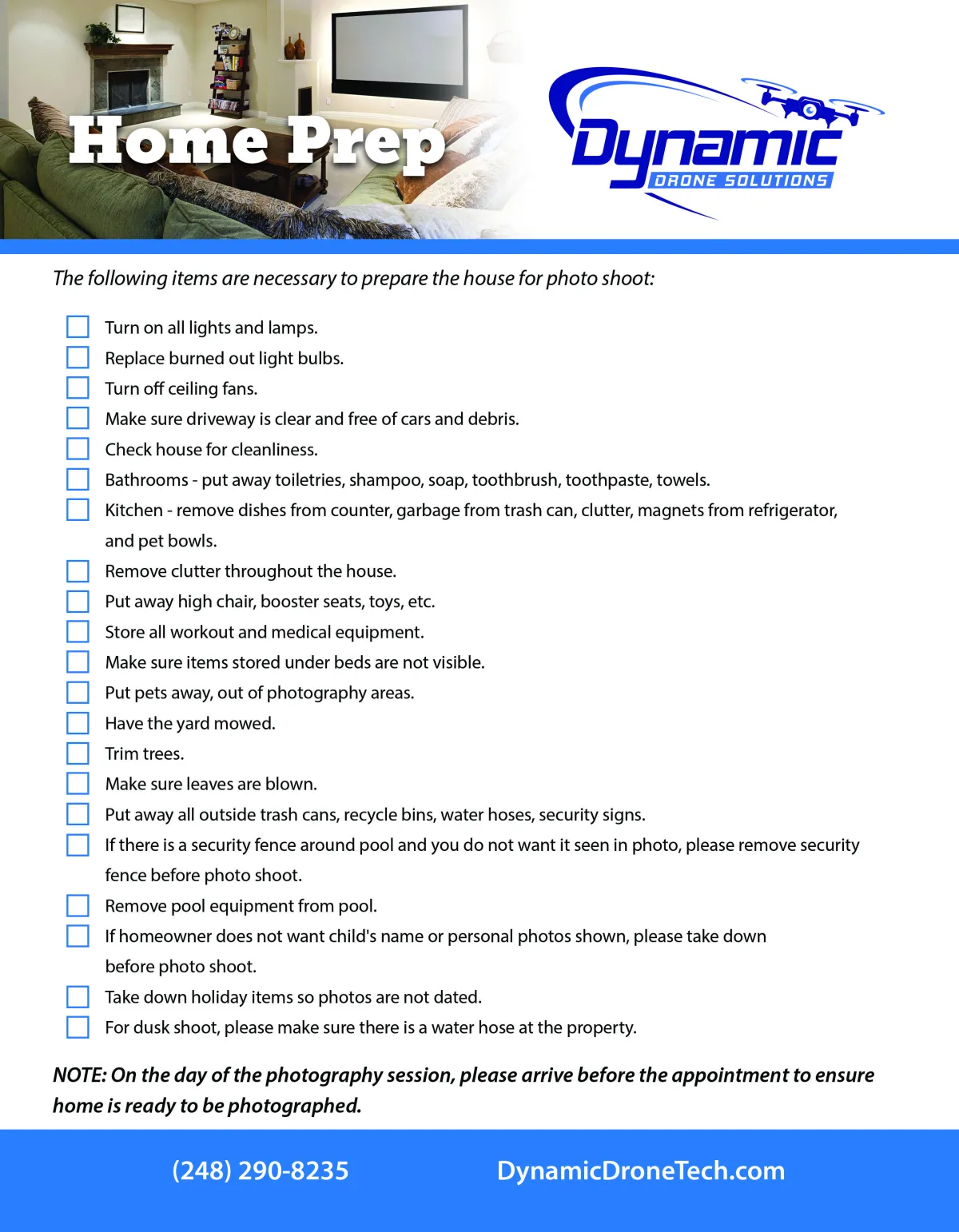After setting an appointment with Dynamic Drone Solutions, please review the home preparation flyer to ensure your property is ready for the photo shoot. Here you will see all those requirements for photography